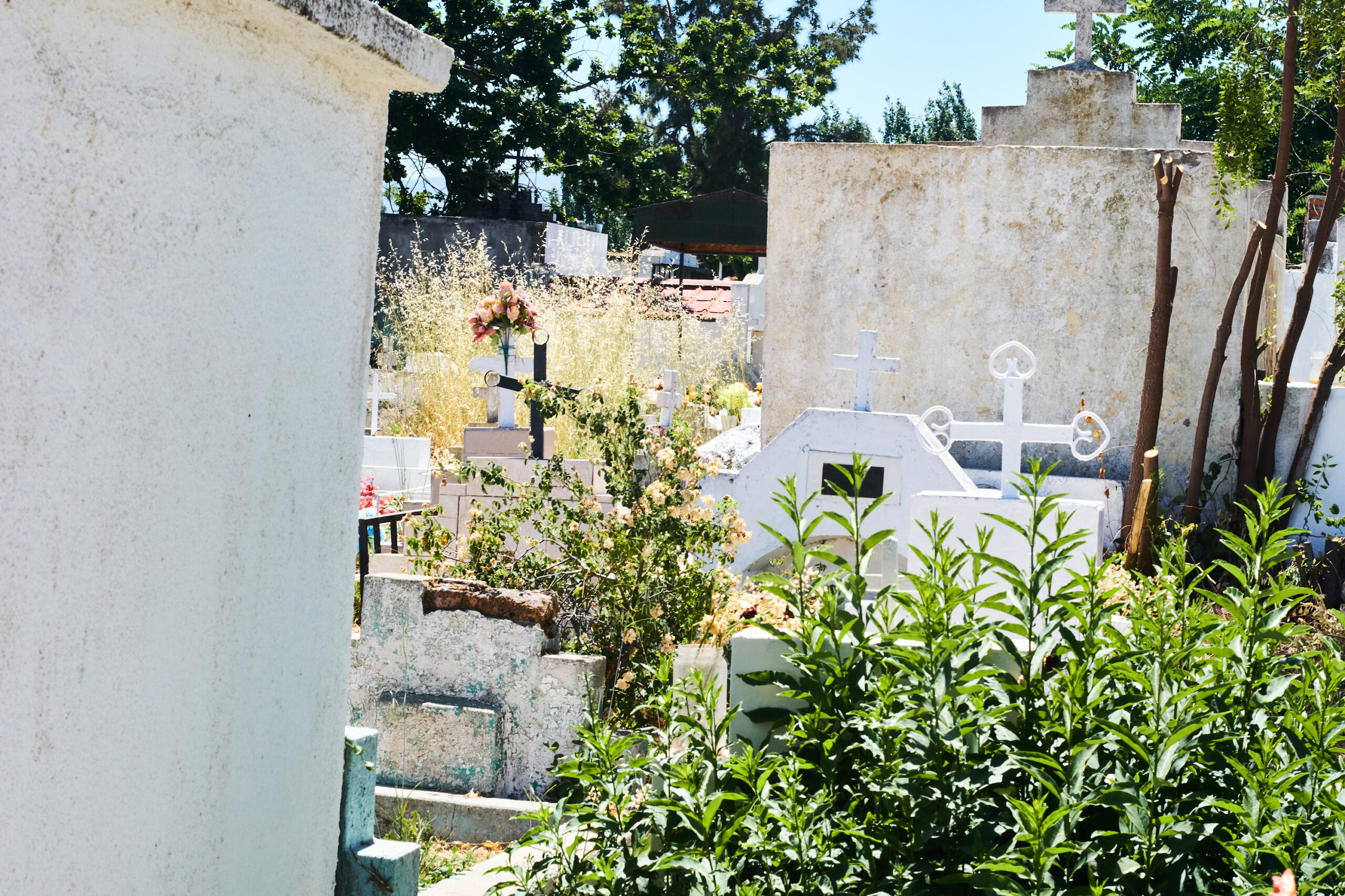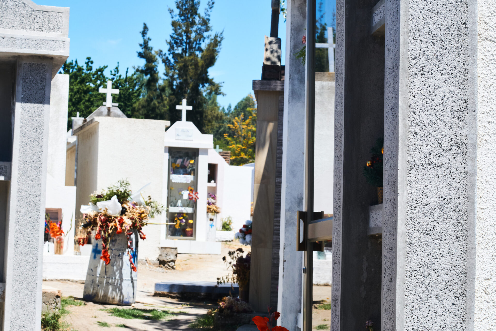 Basta entrar para encontrarse con un mapa que divide el camposanto en 18 manzanas, sus calles llevan los nombres de las localidades vecinas —Santa Eugenia, El Parrón, Las ánimas, Cocalán, Quilamuta—y no se ven más visitantes que algún grillo ocasional camuflado en el marrón del suelo y uno que otro albañil levantando un nuevo mausoleo, quizás reparando construcción dañada. Se divide —informalmente, nada lo señala— entre el sector nuevo y el antiguo; en el nuevo predomina una idea higienista y ascéptica del cambio de estado —de vivo a inerte—: mucho vidrio y metal barato, poca piedra mucha foto y mensaje de alegría, mucho sol también y poco lugar para estar, para sentarse, como si acá se viniera solo a depositar osamenta y no resguardar memoria. Lo que predomina también en la parte nueva es que tumbas a suelo no hay, apenas un par de paredes —tristes, escuálidas, minúsculas— destinadas a nichos y el resto todo mausoleo, hay mucha bandera de Colo–Colo, mucha referencia a fierros y motos, a camiones, mucha foto deslavada, mucho ladrillo esparcido en el suelo, cada tanto un tambor con flores y vegetación en descomposición. Se repiten los nombres, también: mucho Raúl, mucha Gladys, mucho José, algún Roberto, mucha Rosa, mucha Mercedes, también Matilde, Orlando, Sonia, se encuentra un Leoncio, un Cayetano, una Celia, un Valdovino, una Cilina. Los muertos son, en general, muy jóvenes o muy viejos, como si la gente acá dejara de existir solo por tragedia o por vejez, sin medias tintas. «Gracias por su protección y amor», se lee en marcador celeste en uno de los muchísimos vidrios que aíslan cada pequeño mausoleo, «Súper Mamá y Capitán América» aparecen como firmantes.