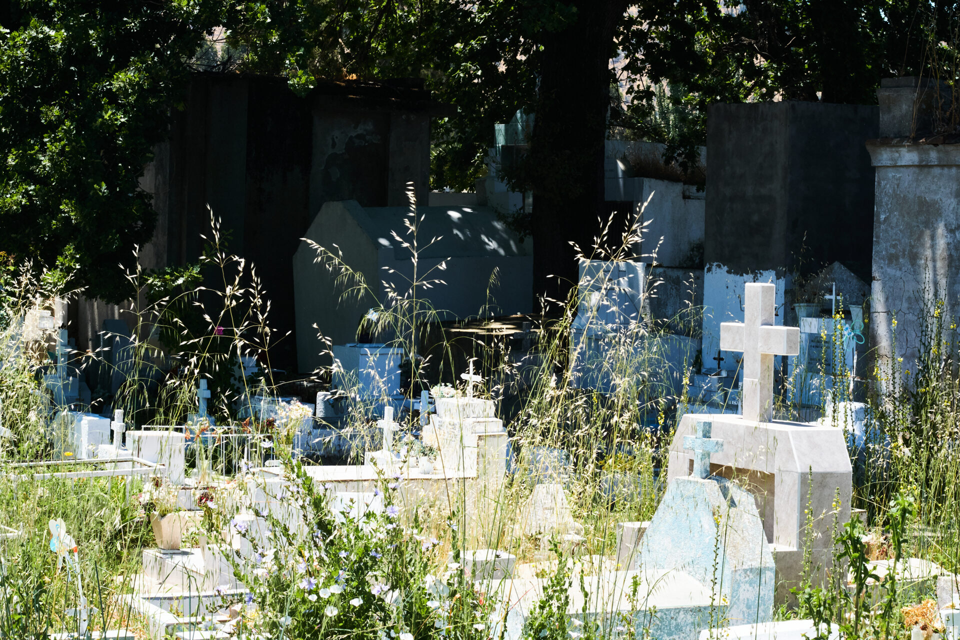 El paso del sector nuevo al antiguo no está delimitado pero se siente en la atmósfera: un silencio más hondo, una calidez distinta, un descanso más profundo, más asentado. Los nichos dan cuenta de su vejez —acá hay por montones— y aparece la vegetación y la fauna que del otro lado no habita: robles, quebrachos —falso quebracho, diría alguna: Senna candelloana, para mayor precisión—, rosales y casuarinas llenan el aire de olores y ruidos, dan espacio a la sombra, atraen aves de todo tipo, albergan, quizás, mamíferos pequeños, lagartijas, insectos. En el límite hay un canal cuyo ruido completa un cuadro que resulta, al menos, más acogedor. Hay otra arquitectura, también: mucha piedra —tallada, esculpida—, mármoles, rejas, cruces de madera esparcidas por el suelo señalando en todas direcciones. Destacan dos patios internos en los que lo individual parece dar paso a lo colectivo: las tumbas —todas a tierra— se mezclan, se invocan, se abrazan, los pasadizos que las delimitan ya casi no existen, se borronearon con el tiempo; basta avanzar algunos pasos para ya no estar seguro si lo que se pisa es tierra es cuerpo o es hueso; visto de lejos parece una comunidad autónoma y establecida, la vegetación —malezas, brotes silvestres, Avena sativa (ea)—se fue tomando los intersticios, fue horadando las tímidas rejas que algunos deudos pusieron para cuidar a sus difuntos: nada es hombre, nada es tierra, acá es todo junto.
